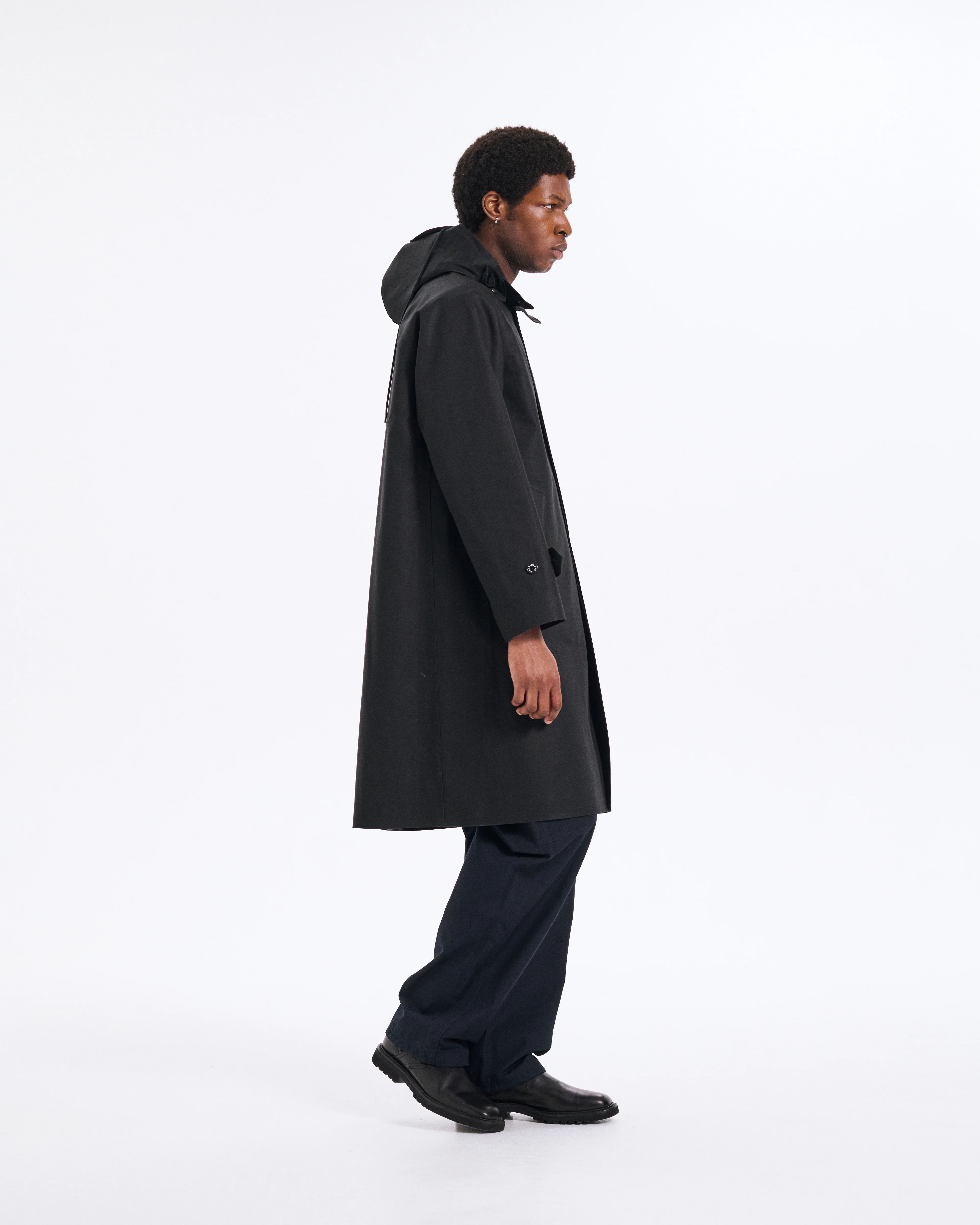 Car coat in bonded cotton, made in Scotland for the collaboration between Mackintosh and C.P. Company. The two-layer cotton fabric, bonded with a rubberised membrane, provides optimal protection from water and wind while maintaining a refined aesthetic. Each fabric panel is sewn, attached, and sealed by hand with a special glue, and the seams are covered with water-repellent hand-applied and pressed tape to ensure maximum waterproofing and durability. The coat features the iconic Goggle hood, adjustable with elastic cords and removable with snap fasteners. The collar can be worn turned up or kept standing thanks to a fastening button. The front closure features hidden buttons covered by a flap, with a single visible button. The coat is completed with slanted welt pockets featuring hidden buttons, adjustable cuffs with button straps, and an adjustable back hem slit. Regular fit.