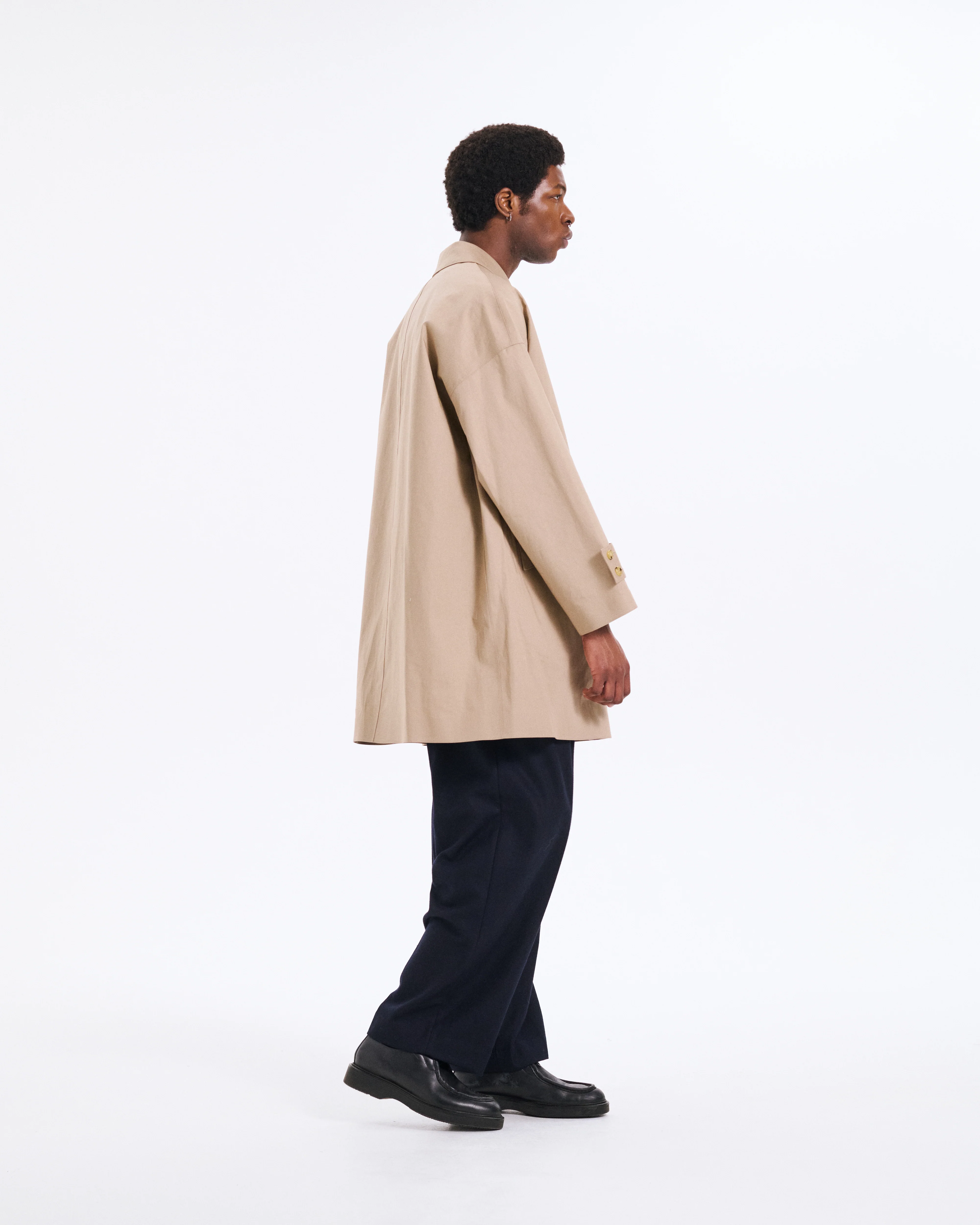 Short balmacaan coat with drop shoulders. The oversized wide silhouette and short length above the knee give it a modern look, while the authentic details such as the rivet-reinforced flap pockets and detachable chin tab make this piece stand out.