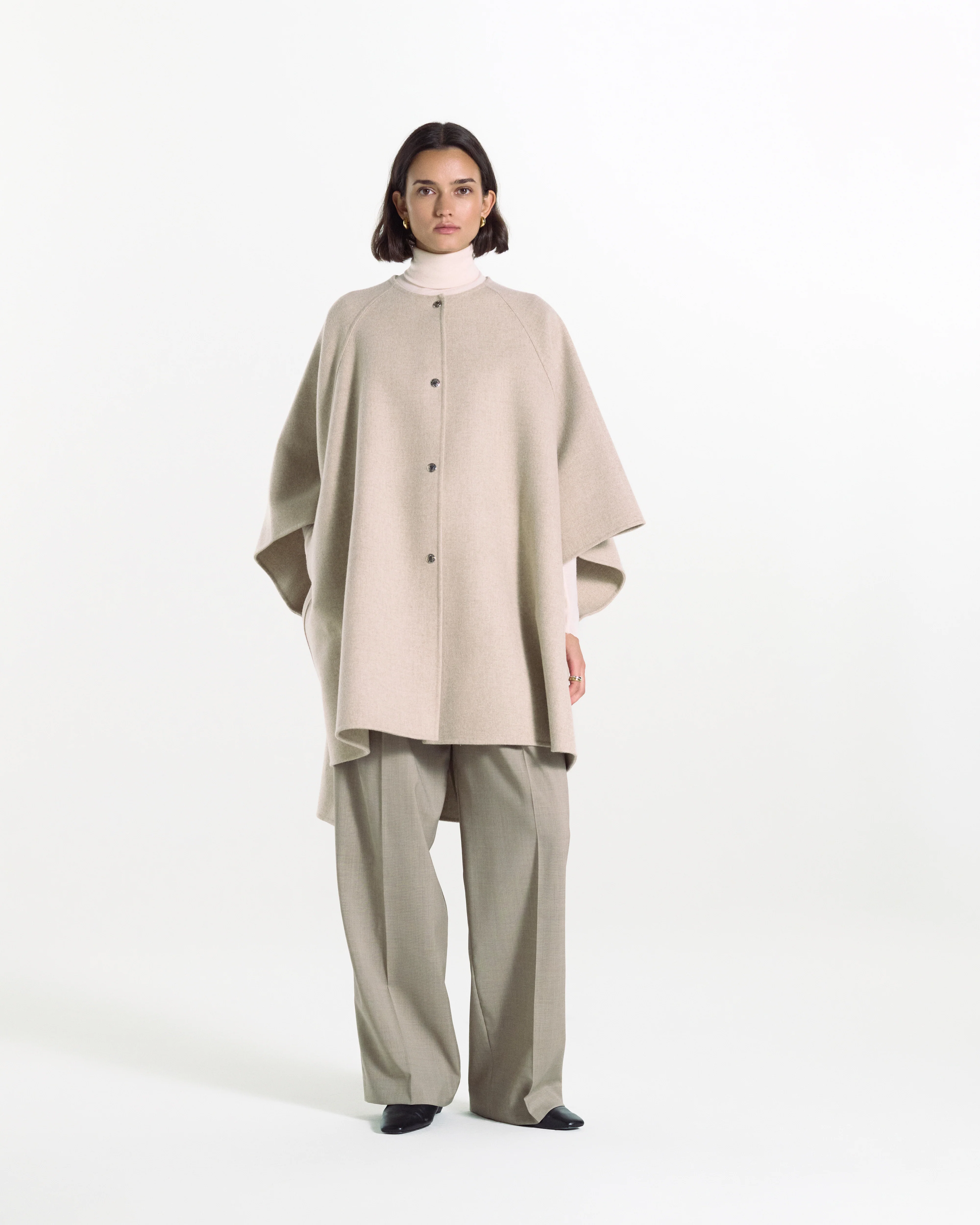 A handmade cape coat made from high quality double-faced material. It has a minimalist design that is light and comfortable, has a beautiful drape, and shows off its high-quality tailoring.