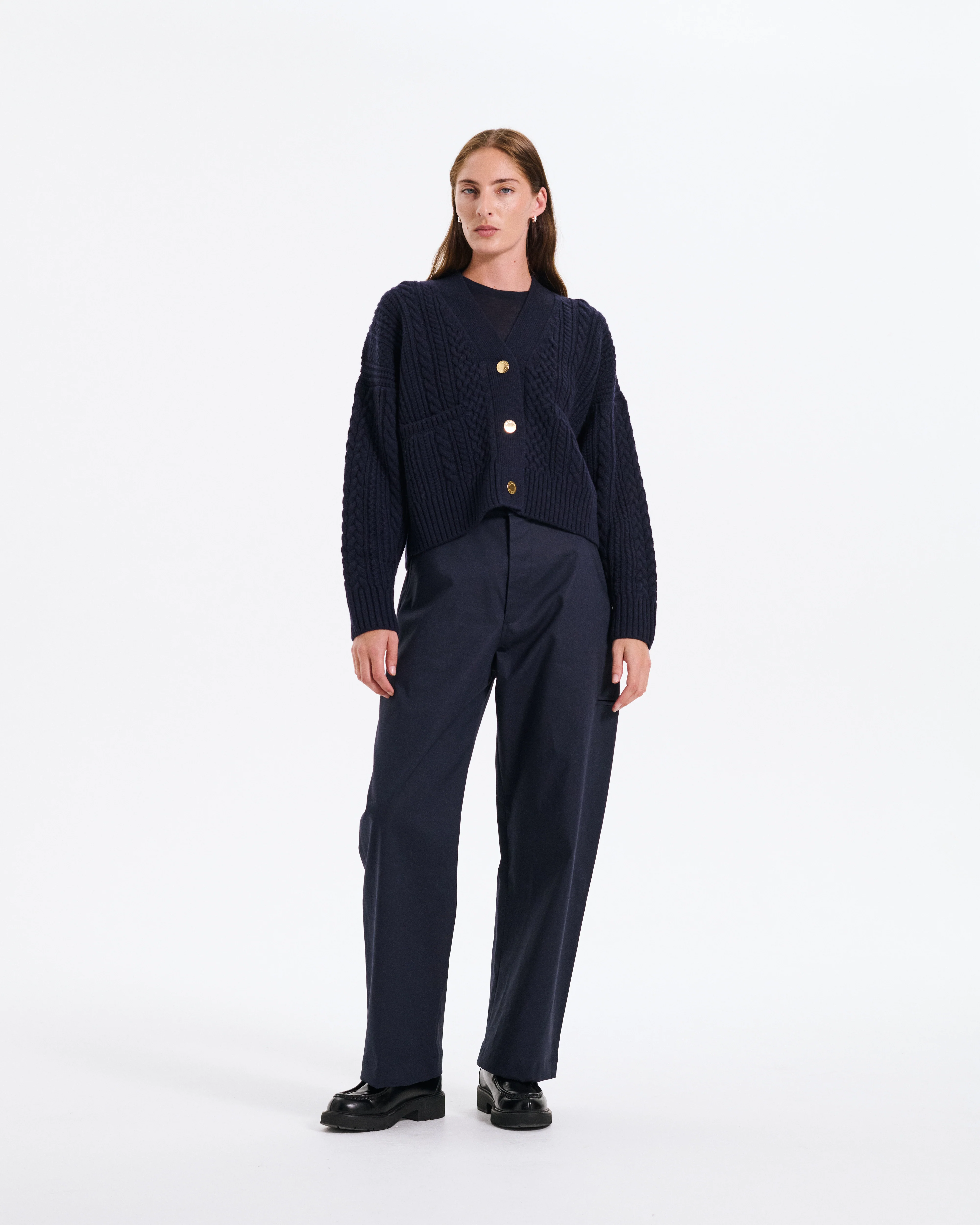 The Cable Cardigan is crafted by BATONER in a wonderful blend of 80% wool and 20% Alpaca.